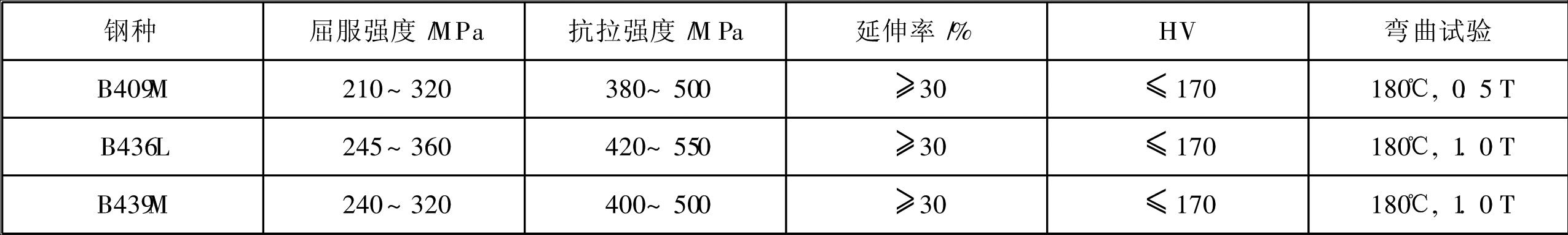 表3 宝钢B409M、 B436L、 B439M 不锈钢基本力学性能标准